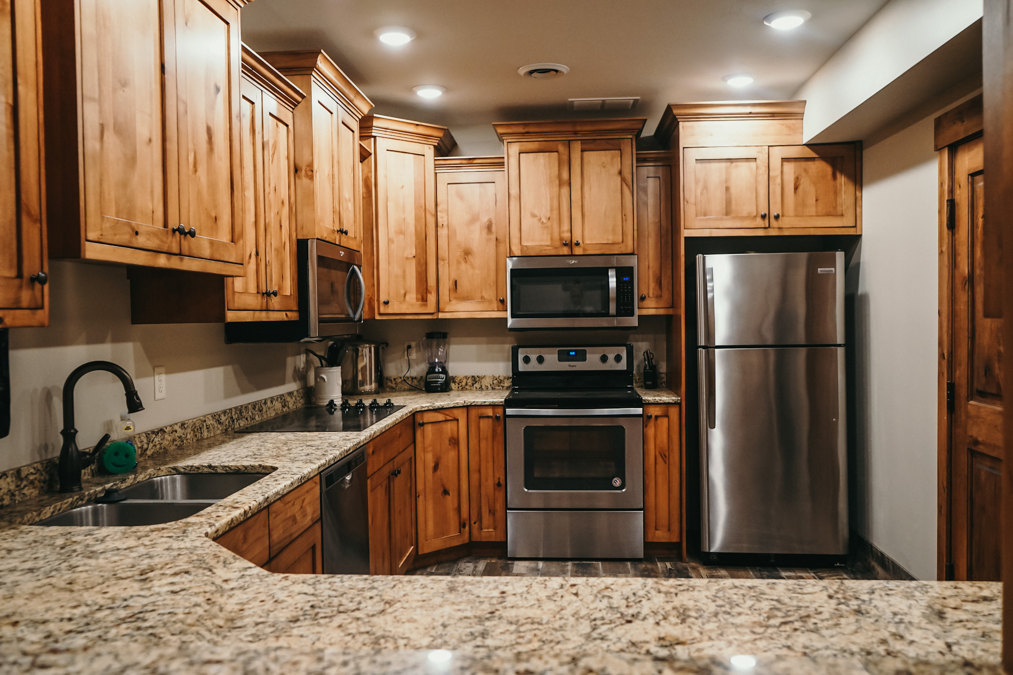 One King Bedroom, Two Queen Bunkbeds & 2 Twin Bunkbeds in one room, Kitchen, 2 Bathrooms, Living Room with Pullout Couch, Patio w/Hot Tub.