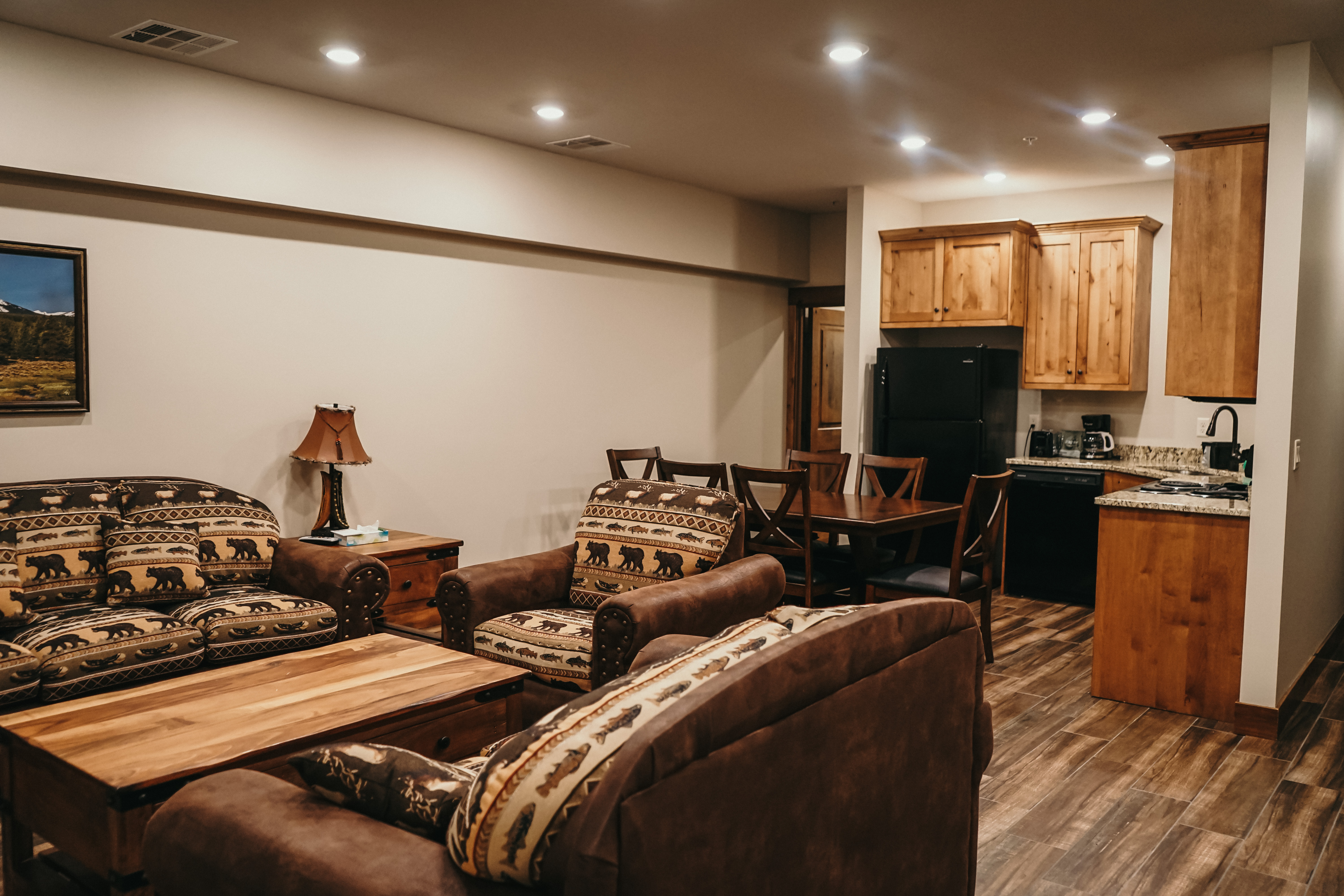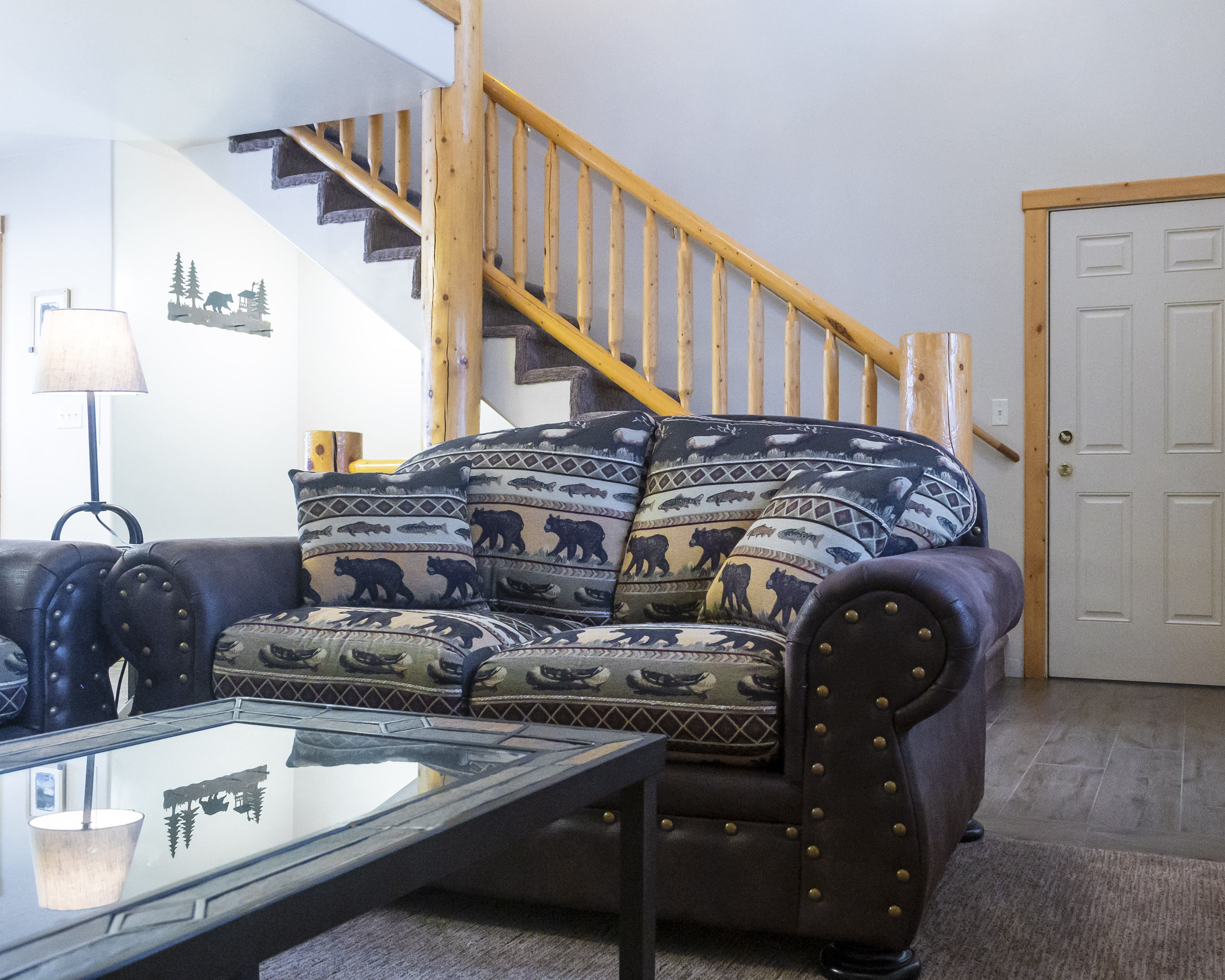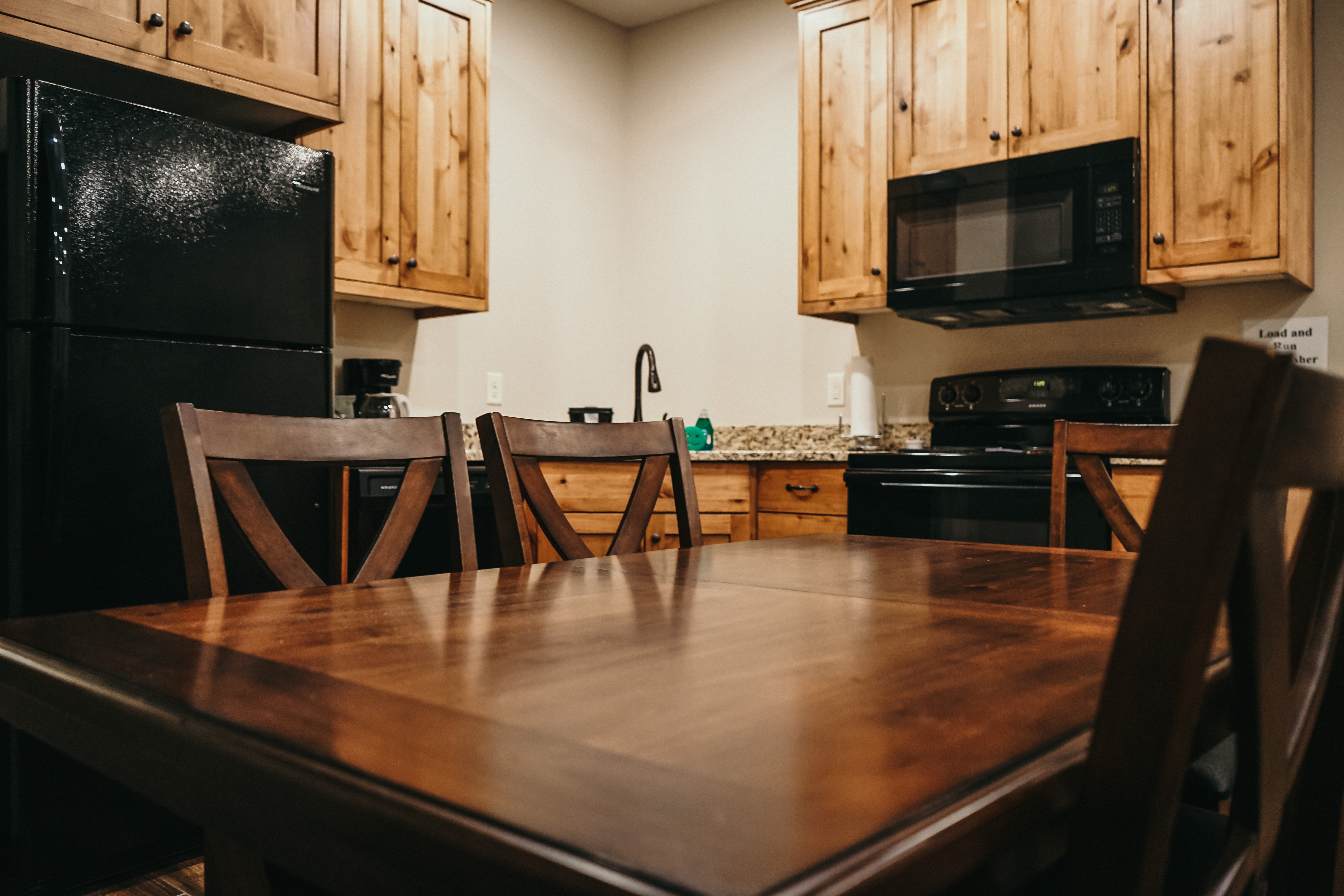 Our cabins sleep 8 guests comfortably with a total of 3 queen beds and a sofa pullout in the living room. Cooking is easy with a kitchen that is stocked with cookware, silverware, oven, refrigerator, microwave, coffee maker, toaster, and dishwasher. The dining area has seating for 6. Warm up in front of the fireplace or relax in the hot tub on your private patio. Enjoy the beautiful views from the deck out back. Every cabin has a washer and dryer. Three cabins can be adjoined for larger groups or family reunions. Cabin guests have access to the indoor pool and hot tub, game room, and pickleball court.