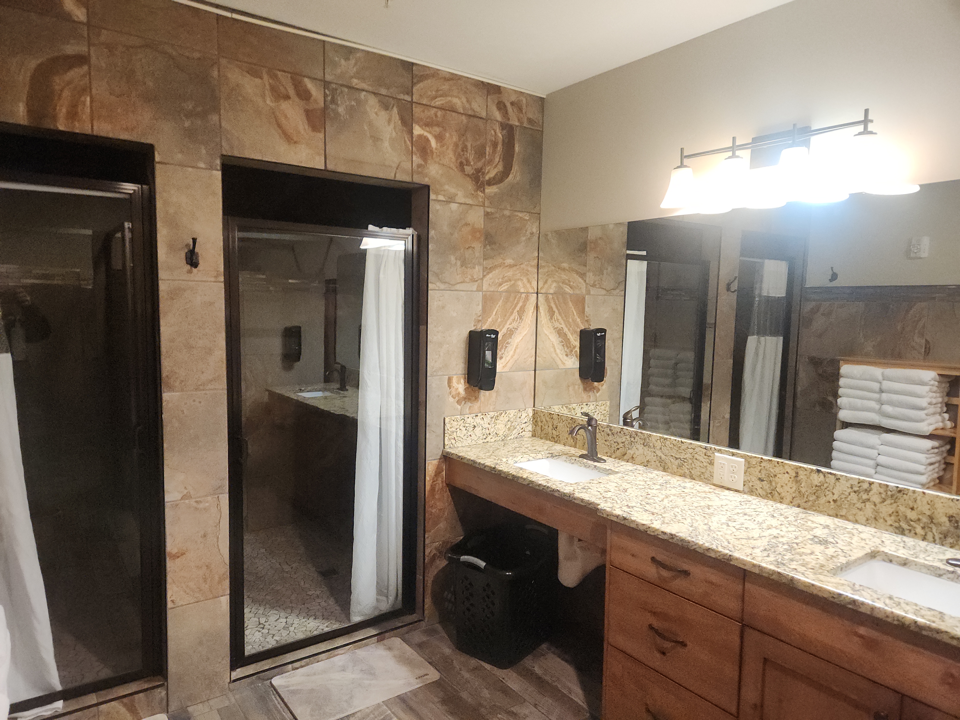 Limited ADA Accessibility. Plenty of room for a wheelchair but not a wheel in shower. No bathtub. 50 inch TV, Fast Fiber High Speed Internet.