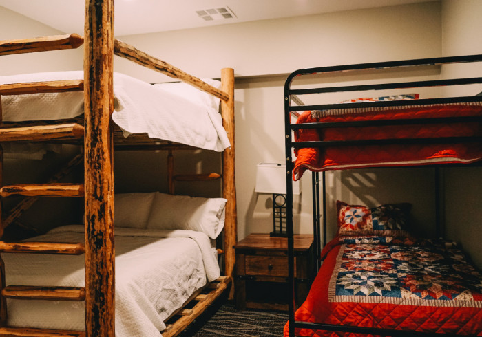 The bunkhouse at Sawtelle Mountain Resort is a fun and affordable option with two large rooms and a total of 20 queen beds, allowing 40 people to sleep comfortably. The bunkhouse has a full kitchen, access to a projector, and 2 full bathrooms which have a total of 4 separate showers.
