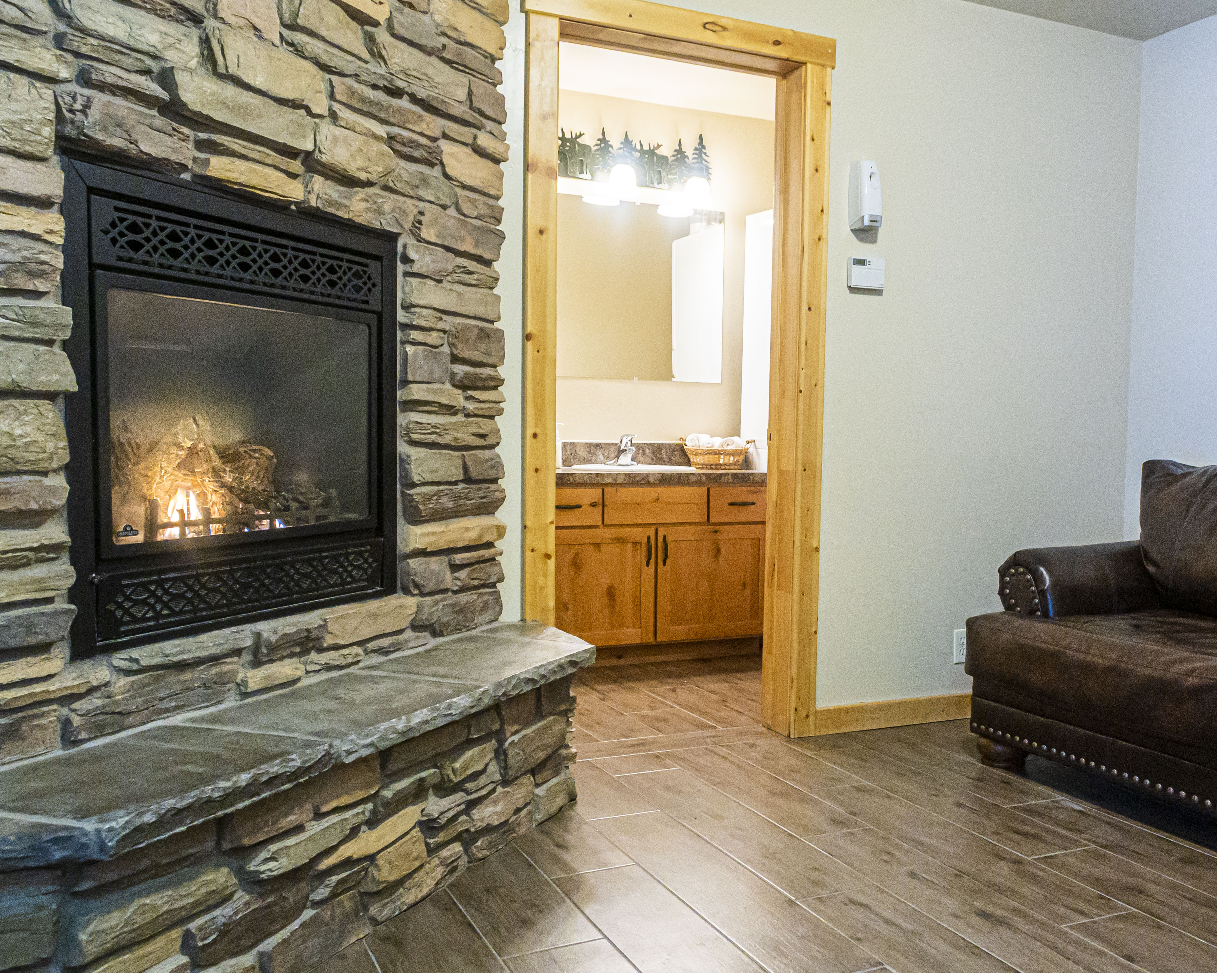 Our cabins sleep 8 guests comfortably with a total of 3 queen beds and a sofa pullout in the living room. Cooking is easy with a kitchen that is stocked with cookware, silverware, oven, refrigerator, microwave, coffee maker, toaster, and dishwasher. The dining area has seating for 6. Warm up in front of the fireplace or relax in the hot tub on your private patio. Enjoy the beautiful views from the deck out back. Every cabin has a washer and dryer. Three cabins can be adjoined for larger groups or family reunions. Cabin guests have access to the indoor pool and hot tub, game room, and pickleball court.